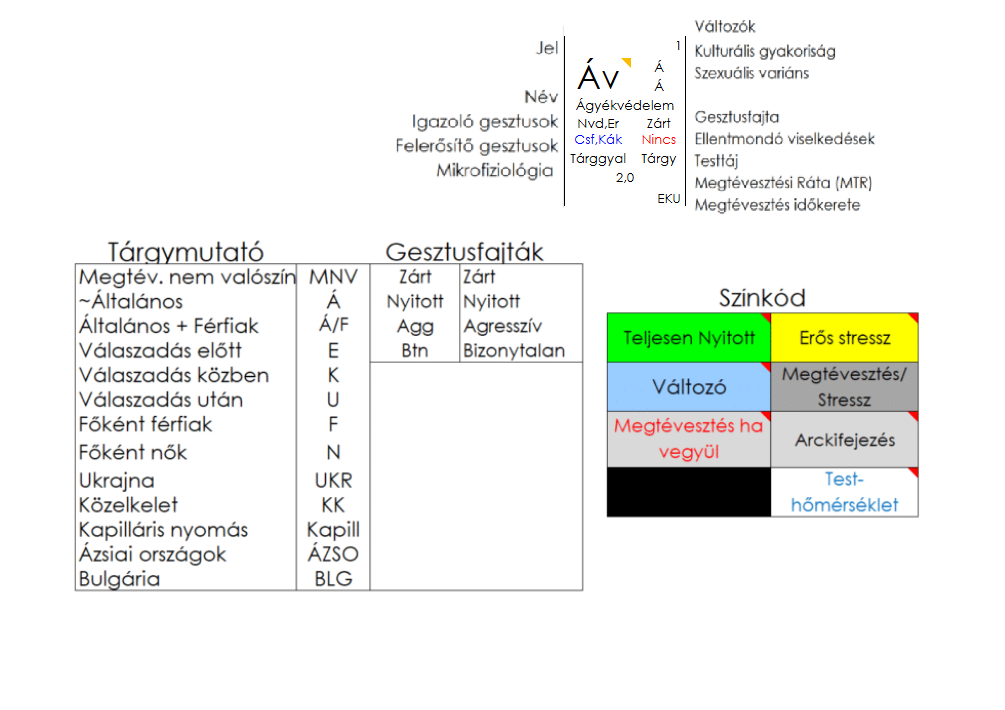 Igazoló gesztusok a nemi védekezés (Nvd) és az elrejtés (Er), ellentmondó gesztusa nincs. Felerősítő gesztusok a csípőfókusz (Csf) és a kézátkarolás (Kák). Ez a gesztus a zárt kategóriába tartozik.
