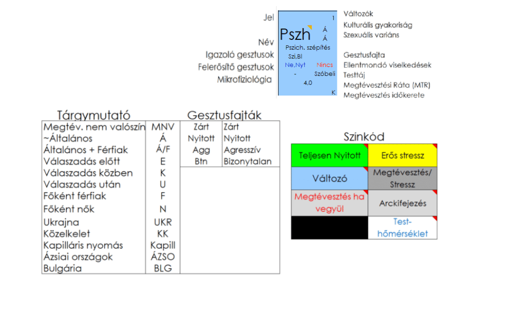 Igazoló gesztusok a szemkörnyéki izomösszehúzódás (Szi) és a bólintás (Bl), ellentmondó gesztusa nincs. Felerősítő gesztusok a nem (fejrázás) (Ne) és a nyitott tenyér (Nyt).