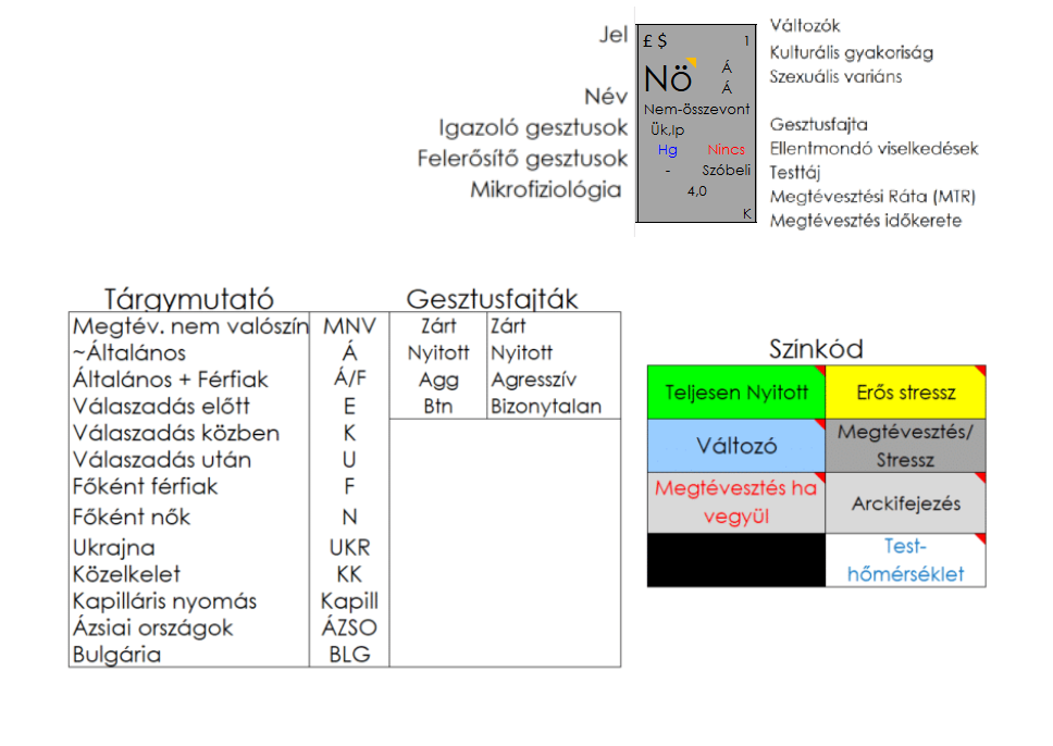 Igazoló gesztusok az ütemes kézmozdulatok (Ük) és az igazoló pillantás (Ip), ellentmondó gesztusa nincs. Felerősítő gesztusként haragot (Hg) figyelhetünk meg.