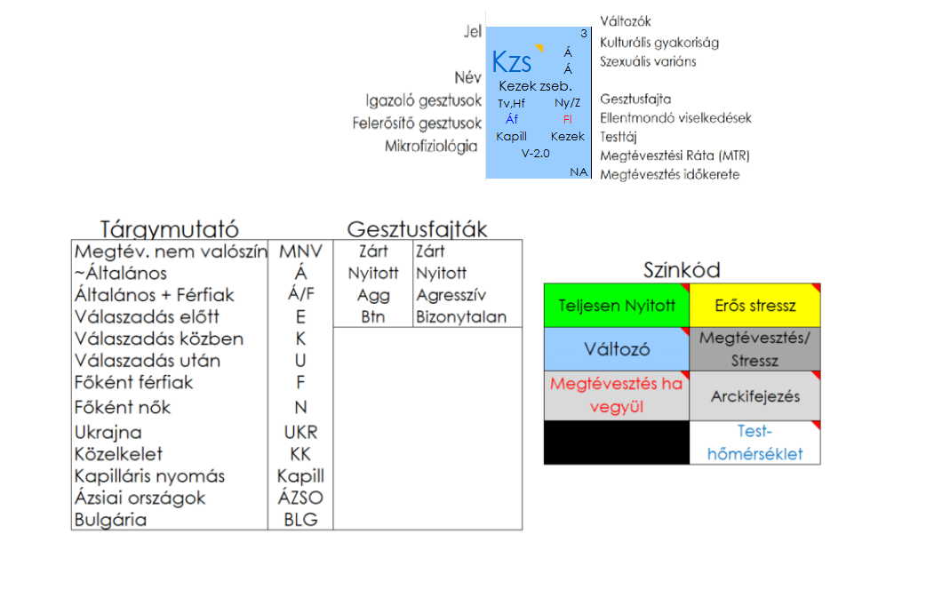 Igazoló gesztusok a testtartás-változás (Tv) és a hátradöntött fej (Hf), ellentmondó gesztus a fejledöntés (Fl). Felerősítő gesztusként ágyékfelfedést (Áf) figyelhetünk meg. Ez a gesztus lehett nyitott és zárt is.