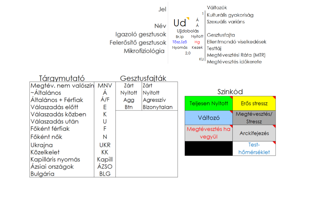Igazoló gesztusok a babrálás (Br) és az igazoló pillantás (Ip), ellentmondó gesztus a harag (Hg). Felerősítő gesztusként térdösszeszorítást (Tösz) és szöszölést (Szö) figyelhetünk meg. Ez a gesztus a nyitott kategóriába tartozik.