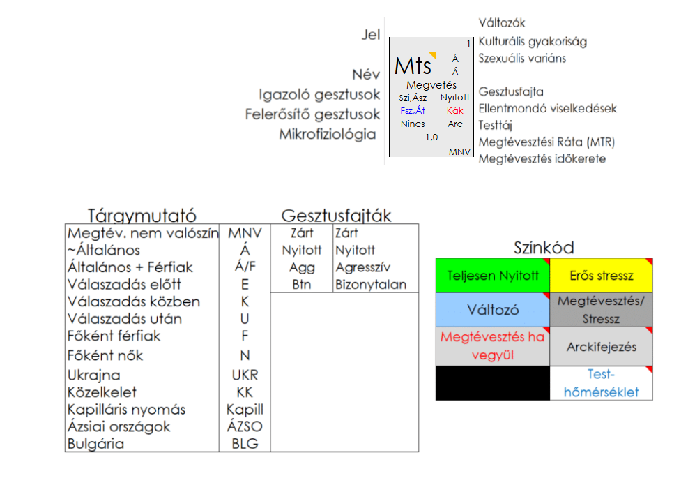 Igazoló gesztusok a szemkörnyéki izomösszehúzódás (Szi) és az állkapocs-szorítás (Ász), ellentmondó gesztus a kézátkarolás (Kák). Felerősítő gesztusok a fogszívás (Fsz) és az állkitolás (Át). Ez a gesztus egy arckifejezés, és a nyitott kategóriába tartozik.