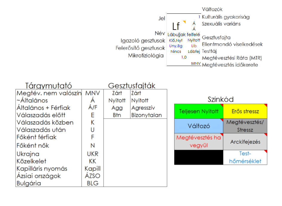 Igazoló gesztusok a kezek levegőben (Klő) és a nyitott tenyér (Nyt), ellentmondó gesztus az ujjbehajlítás (Ub). Felerősítő gesztusok az ujjkinyújtás (Uny) és a boldogság (Bg). Ez a gesztus a nyitott ketegóriába tartozik.