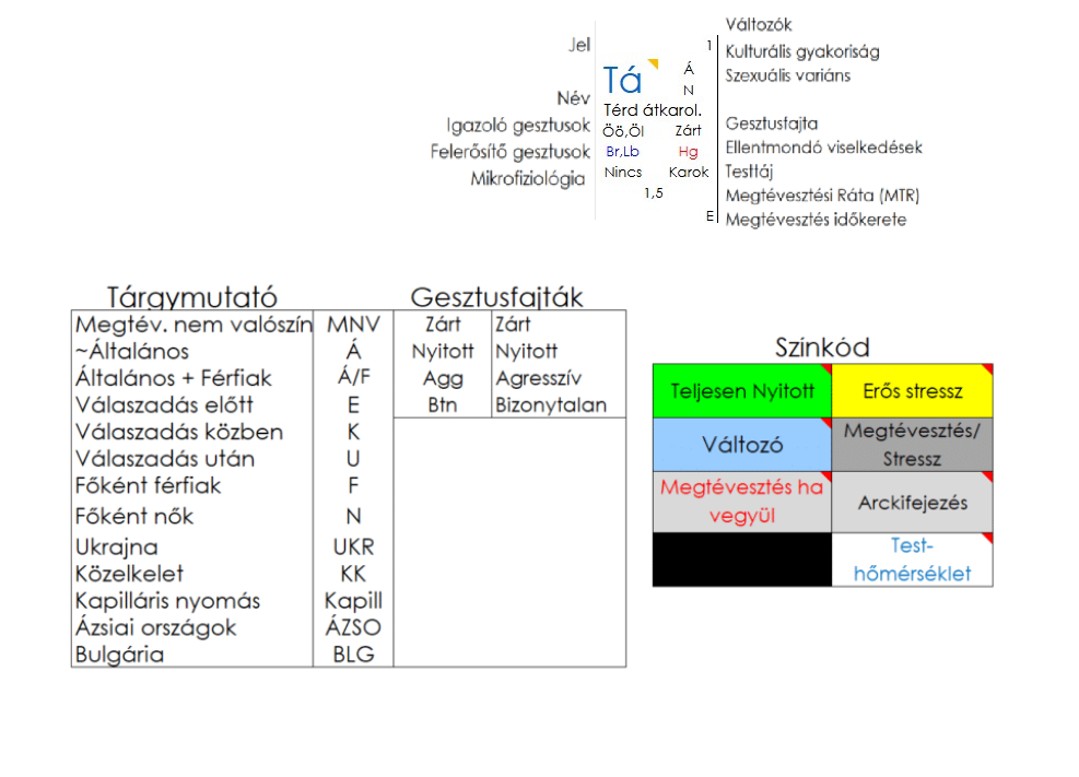 Igazoló gesztusok az önölelés (Öö) és az összezárt lábak (Öl), ellentmondó gesztus a Harag (Hg). Felerősítő gesztusok a babrálás (Br) és a lábak befele (Lb).