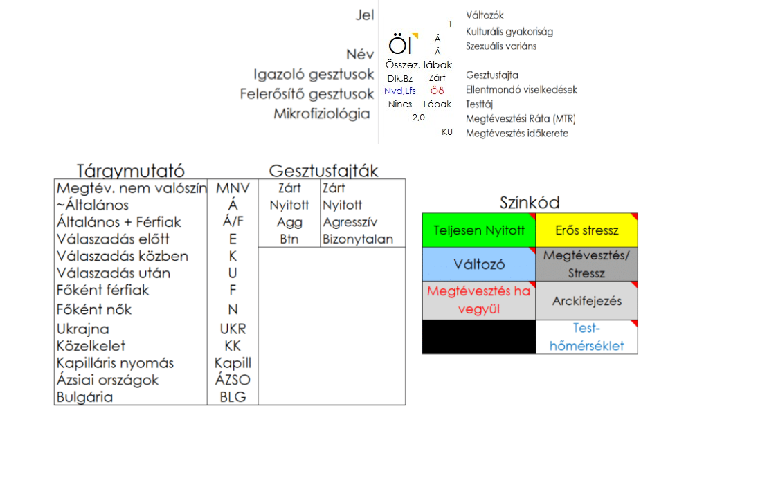 Igazoló gesztusok a dupla lábkereszt (Dlk) és a bokazár (Bz), ellentmondó gesztusok a nemi védekezés (Nvd) és a lefagyás (Lfs). Felerősítő gesztus az önölelés. Ez a gesztus a zárt kategóriába tartozik.