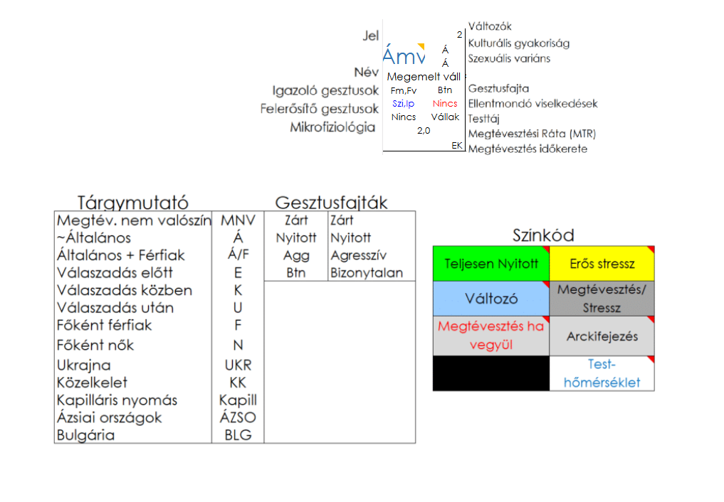 Igazoló gesztusok a félelem (Fm) és a fél vállvonás (Fv), ellentmondó gesztusa nincs. Felerősítő fesztusok a szemkörnyéki izomösszehúzódás (Szi) és az igazoló pillantás (Ip). Ez a gesztus a bizonytalan kategóriába tartozik.