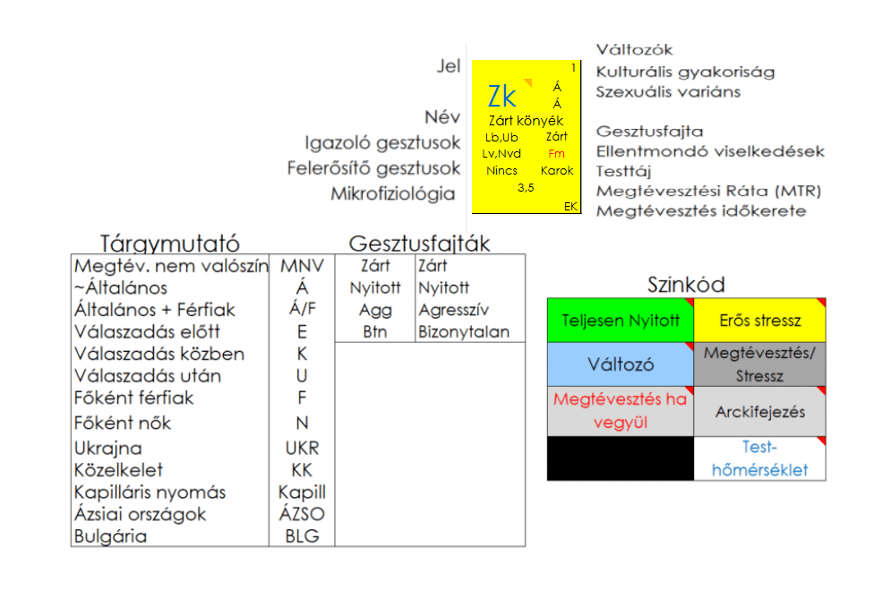 Igazoló gesztusok a lábak befelé (Lb) és az ujjbehajlítás (Ub), ellentmondó gesztus a félelem (Fm). Felerősítő gesztusok a láb-visszavét (Lv) és a nemi védekezés (Nvd). Ez a gesztus a zárt kategóriába tartozik.