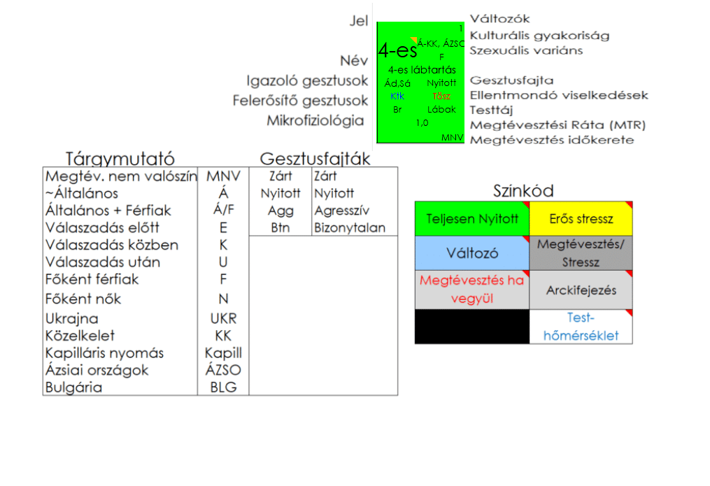 Igazoló gesztusok az álldötzsölés (Ád) és a sátrazás (Sá), ellentmondó gesztus a térdösszeszorítás (Tösz). Felerősítő gesztus a keresztbe tett kar (Ktk). Ez a gesztus a nyitott kategóriába tartozik.