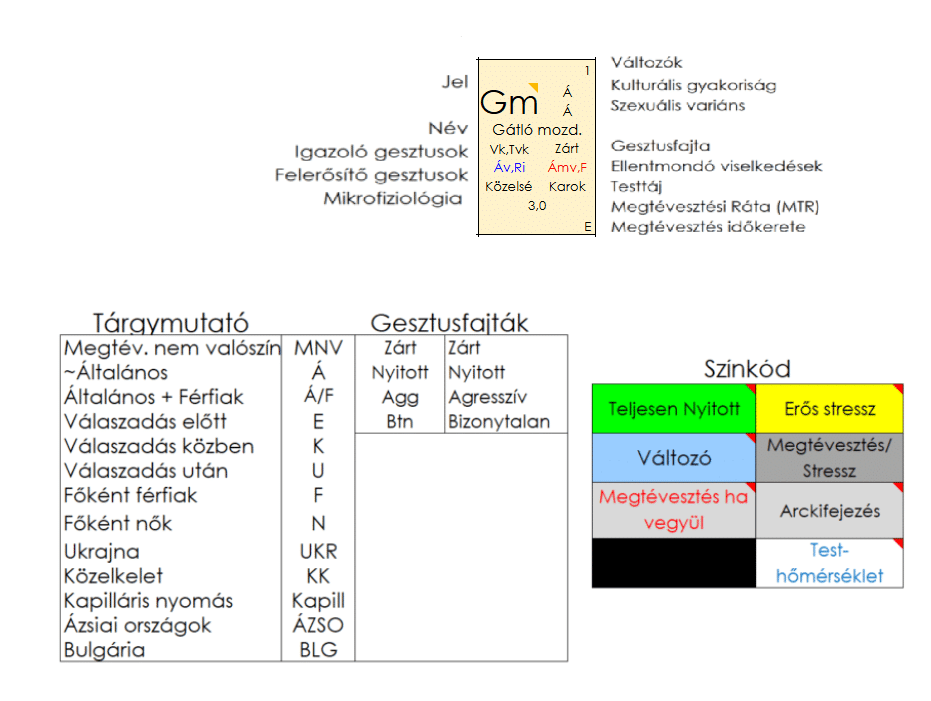 Igazoló gesztusok a védekezés (Vk) és a tárggyal védekezés (Tvk), ellentmondó gesztus az állandóan megemelt váll (Ámv) és a félelem (Fm). Felerősítő gesztusok az ágyékvédelem (Áv) és a ruhaigazítás (Ri). Ez a gesztus a zárt kategóriába tartozik.