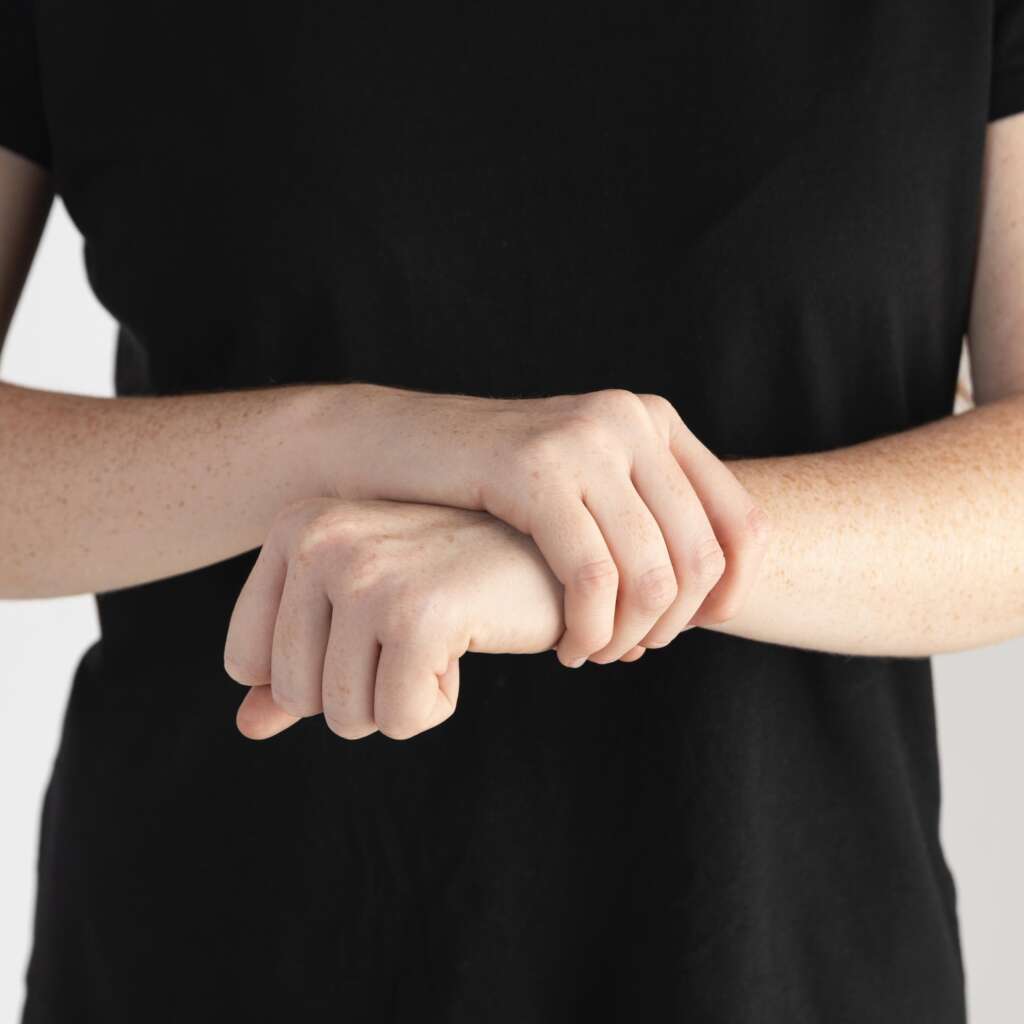 Ez a viselkedés is egy az auto-kontakt viselkedések közül, amely a csukló megérintésével történik. Zárt gesztusként szerepel a gátat létrehozó tulajdonságai és a társadalmi kontextusban betöltött jelentése miatt. Ez a viselkedés gátként és megnyugtató mozgásként szolgál, és védettséget és biztonságérzetet ad az alanyoknak szociális nyomás, idegesség vagy szorongás esetén. Gyakran megfigyelhető nyilvánosság előtt álló férfiaknál, amikor átnyúlnak törzsük előtt, és az egyik kezükkel megigazítják a másik kézen viselt karórát vagy mandzsettát. A kézfej ropogtatása, az ingujj megigazítása és minden hasonló viselkedés a csuklóérintés (Csé) viselkedésbe tartozik. A második változat során az alany átnyúl törzse előtt és megragadja csuklóját. Ez egy haraggal kapcsolatos és önmegtartóztató viselkedés, amely teljesen más jelet küld (ezért szerepel piros betűkkel a cellában).
