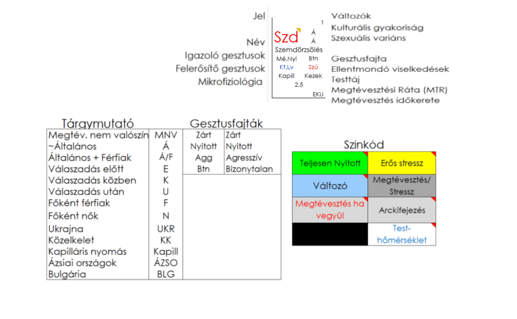 Igazoló gesztusok a mellkasérintés (Mé) és a nyelés (Nyl), ellentmondó gesztus a szomorúság (Szú). Felerősítő gesztusok a kezek a tarkón (Kt) és a láb visszavét (Lv). Ez a gesztus a bizonytalan kategóriába tartozik.