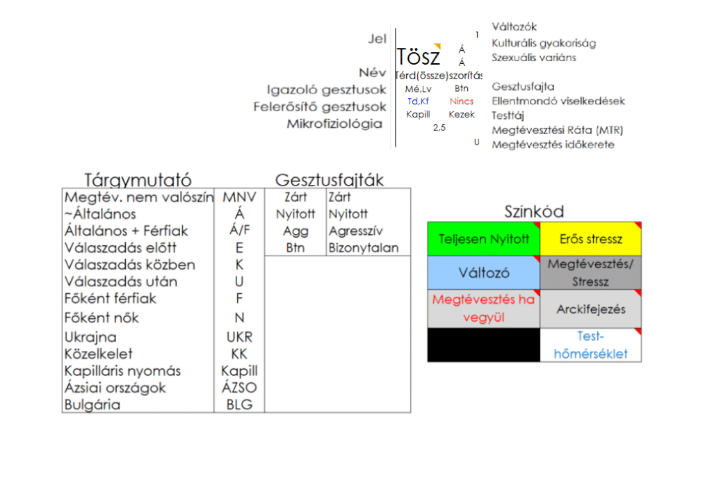 Igazoló gesztusok a mellkasérintés (Mé) és a láb visszavét (Lv), ellentmondó gesztusa nincs. Felerősítő gesztusok a testdöntés (Td) és a kartámaszfonás (Kf). Ez a gesztus a bizonytalan kategóriába tartozik.