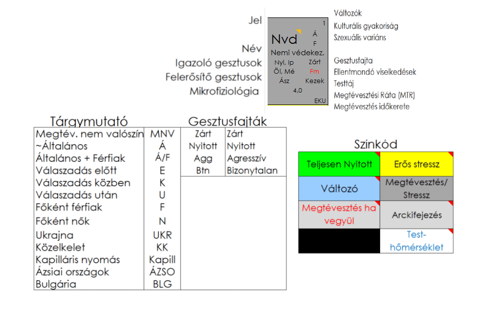 Igazoló gesztusok a nyelés (Nyl) és az igazoló pillantás (Ip), ellentmondó gesztus a félelem (Fm). Felerősítő gesztusok az összezárt lábak (Öl) és a mellkasérintés (Mé). Ez a gesztus a zárt kategóriába tartozik.