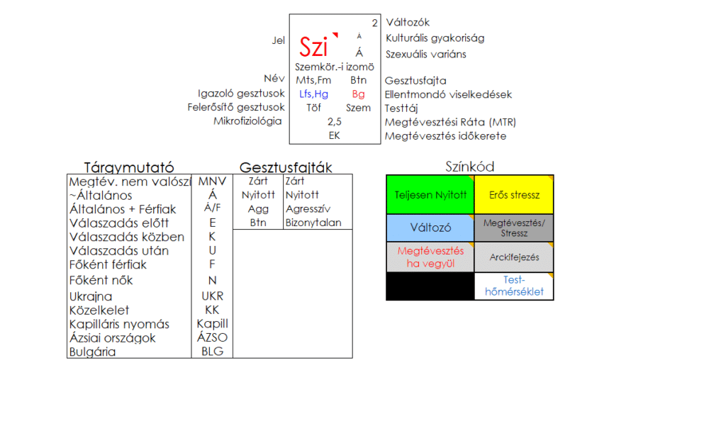 Igazoló gesztusként a Lefagyást (Lfs) és Haragot (Hg) láthatunk. Ellentmondó viselkedésként Boldogságot (Bg) figyelhetjük meg. Ez a gesztusfajta a Bizonytalan (Btn) kategóriába tartozik.