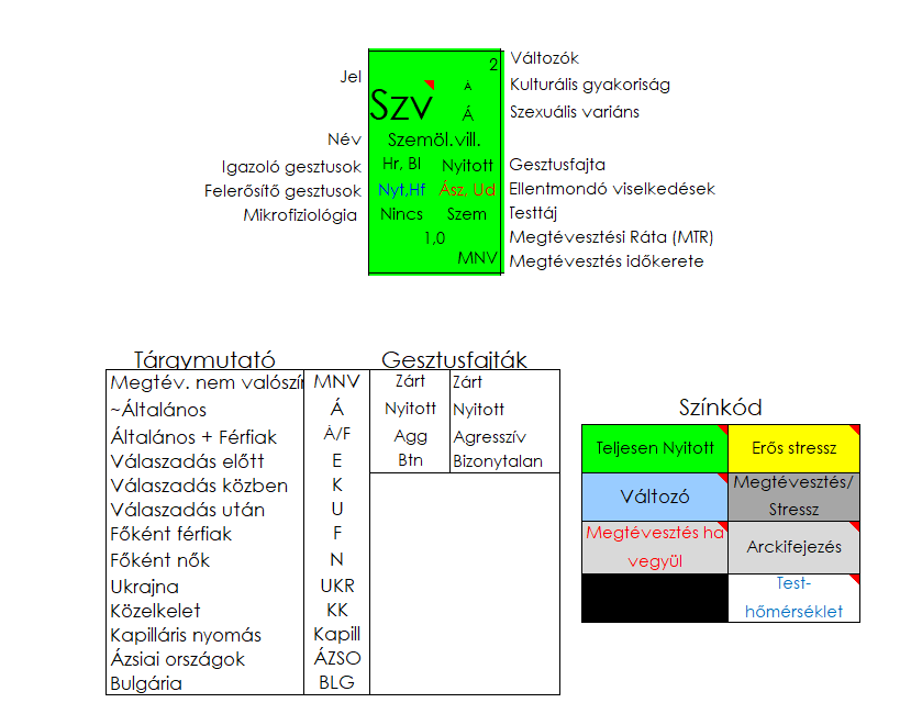 Igazoló gesztusként a Hunyorítást (Hr) és Bólintást (Bl), felerősítő gesztusként a Nyitott tenyereket (Nyt) és az enyhén Hátradöntött fejet (Hf) figyelhetjük meg. Ellentmondó viselkedésként az Állkapocs-összeszorítást (Ász) és az Ujjdobolást (Ud) láthatjuk, ekkor legyünk gyanakvóak az Szv-t illetően.